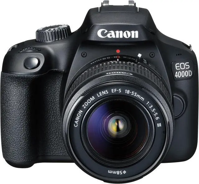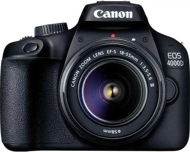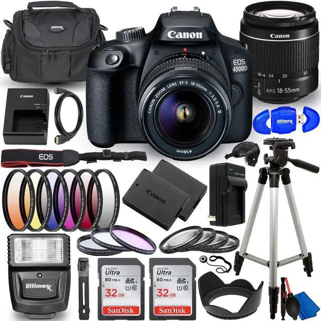 Cannon EOS 4000D / T100 DSLR Camera with EF-S 18-55mm f/3.5-5.6 DC III Lens International Version - Bundle Includes: 2X SanDisk 32GB Memory Cards, Extra Battery, Tripod, Case and More