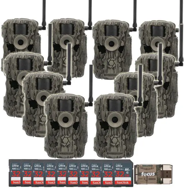 Stealth Cam 36MP Fusion Max Cellular Trail Camera with 80 Feet Detection Range 10-Pack with Ten 32GB Memory Cards and Card Reader (21 Items)