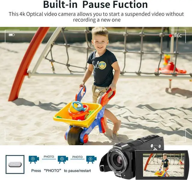 • Multifunctional CamcorderThe 4K camcorder supports Anti-shake, AF-L function, Pause function, Normal video recording, Time-lapse video recording, Loop video recording ; Photo taking, Continuous photo taking, Timed photo taking and Other functions, self-timer, HDMI TV output, maximum 256GB SD card, with hot shoe holder and external microphone jack, support for external fill flash and tripod (tripod not included). The video camera comes with two batteries, Can also record video while charging.