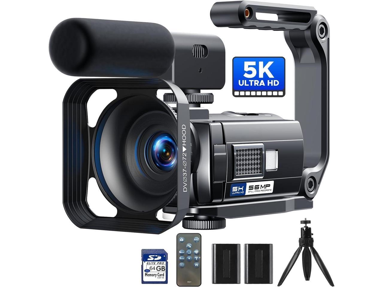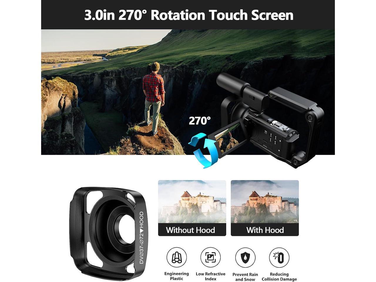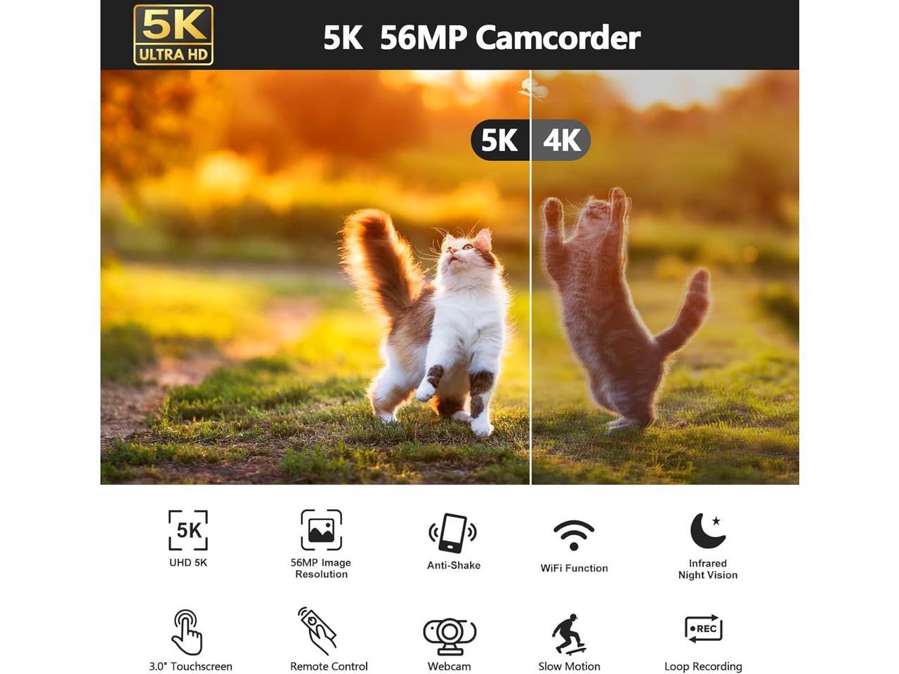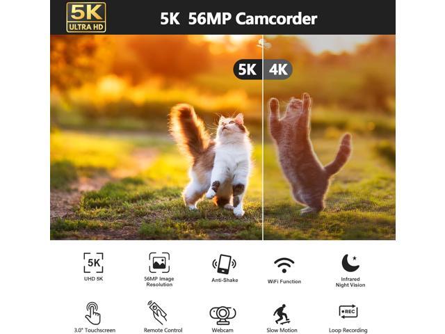 - UHD 5K Video Camera- 5K & 56MP camcorders can capture video footage with a resolution of 5K (around 5120 x 2880 pixels) and 56MP image resolution. 3.0 inch touch screen can rotate at 270° allows you to take photos and record videos at any angle. Video camera 5K supports WDR, playback, continuous shooting, time-lapse, slow motion, loop recording, ect.