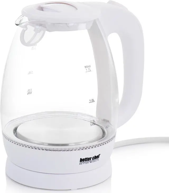 The Better Chef 1.7 Liter Glass 360 Degree Cordless LED Electric Kettle is ready to help kick start your mornings. This single 1.7 liter kettle comes in a sleek glass and white handle design that will accommodate any kitchen. It boils water faster than a standard stove top or microwave. With its stain-resistant borosilicate glass, cleanup is a breeze. Brighten up your day with the kettle's blue LED base!