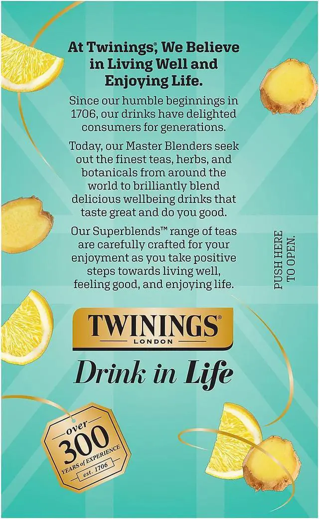 Soothe your stomach as you sip this Twinings Probiotics herbal tea which combines zesty lemon flavor and warming ginger and includes a probiotic for extra digestive support. The soothing citrus tones in this herbal tea are combined with a subtle ginger kick and the warming taste of turmeric. This blend supports your digestive health with the addition of probiotics, which do not add any taste but bring goodness to your cup.