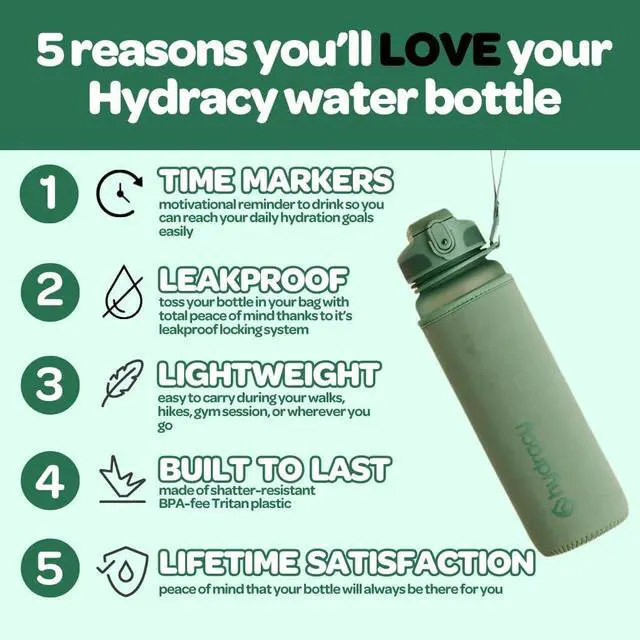 SMART DESIGN Equipped with a detachable travel carry strap, spill proof flip top lid, convenient wide mouth and a Fruit Infusion strainer, your stylish Hydracy water bottle has everything you wanted and more! It also comes with a 27 Detox Fruit infused water recipes eBook bonus!