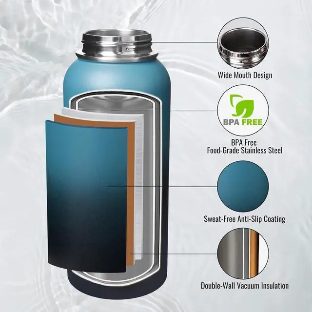 Premium Materials: Our food-grade 304 stainless steel water bottle ensures safe and healthy hydration throughout the day. With a sweat-proof, non-slip coating and being BPA-free, our insulated water bottle is a reliable companion for all activities.