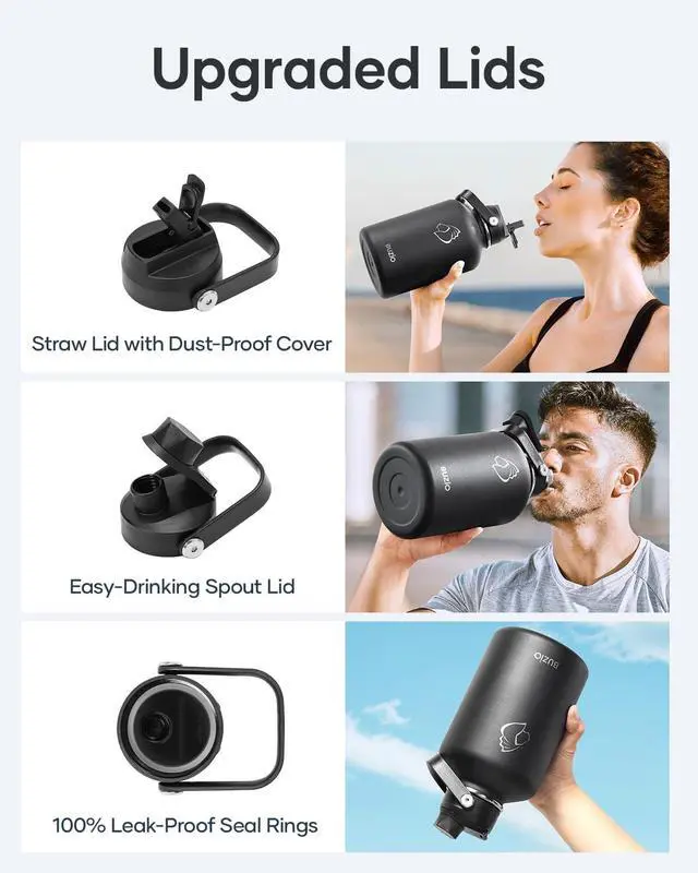 Upgraded Lids & Handle: This Stainless Steel water bottle features two enhanced lids: a staw lid with dust-proof cover and a easy-drinking spout lid, both equipped with 100% leak-proof seal rings. The reinforced, larger handle offers unmatched durability and portability, making it your perfect on-the-go companion. Also, each lid has a thickened sealing ring, which guarantees 100% leak proof.