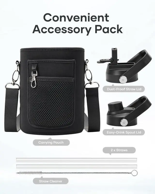Accessories & Warranty: With every purchase, you' ll get a set of practical accessories and a lifetime warranty. The pack includes 1 x carrying pouch, 2 x lids, 2 x straws, and 1 x straw cleaner. This bottle is ideal for camping, hiking, cycling, running, gym sessions, or outdoor work, ensuring you stay hydrated wherever you go.