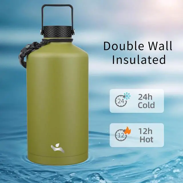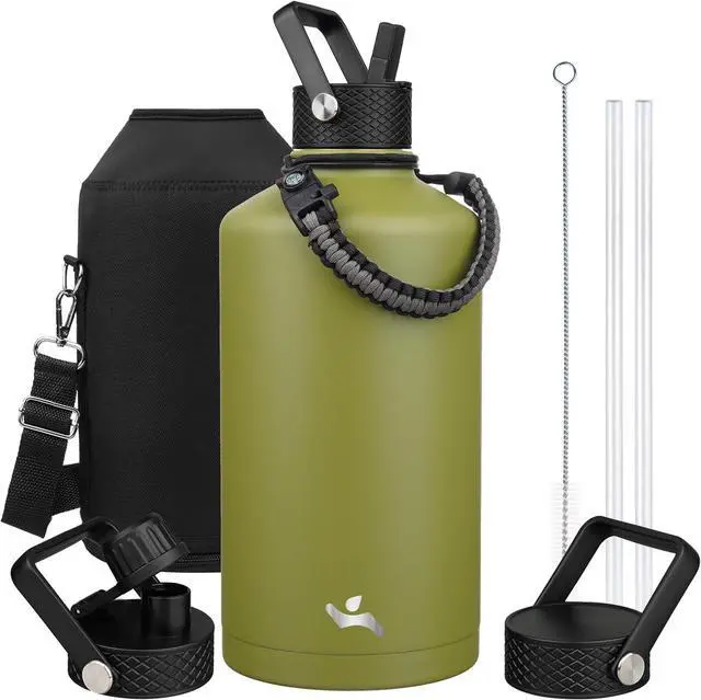 Gallon Insulated Water Bottle with Straw,128 oz 3 Lids Water Jug with Carrying Bag,Paracord Handle, Double Wall Vacuum Stainless Steel Metal Flask,Forest Green