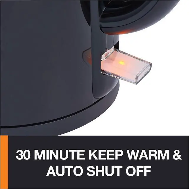 USER-FRIENDLY CORDLESS DESIGN: Cord-free kettle for graceful serving; returns to 360° rotational base from any angle; lid lifts open with the press of a button for easy filling and cleaning