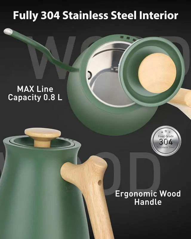 Engineered for Enduring Quality: 100% Stainless steel interior, body, and lid, this gooseneck kettle is built to handle years of heavy daily use; Ergonomic wooden handle with heat insulation, offering exceptional strength and long-lasting performance