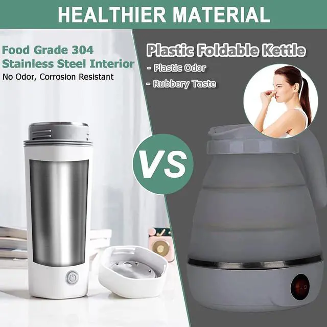 Stainless Steel Interior & Safe and NO Rubbery Taste - This Small electric travel kettle with 304 Stainless Steel Interior and no rubbery taste. No plastic parts are touching the water will safe than plastic foldable kettle in the long run.