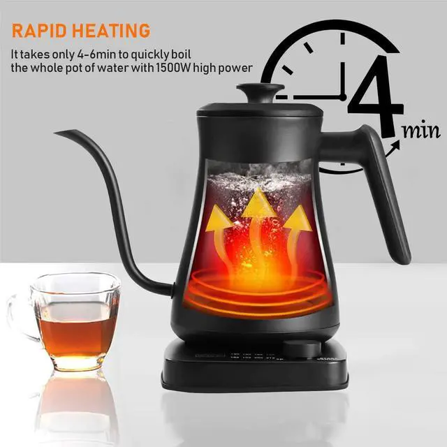 Rapid Heating: Gooseneck kettle electric 1500W high-power three-dimensional surround type rapid heating, which can boil a whole pot of water to boiling in 4-6 minutes, it means you can enjoy a cup of coffee immediately. Be prepared before you finish grinding coffee or prepare a teacup. The best choice for tea fans and coffee lovers.