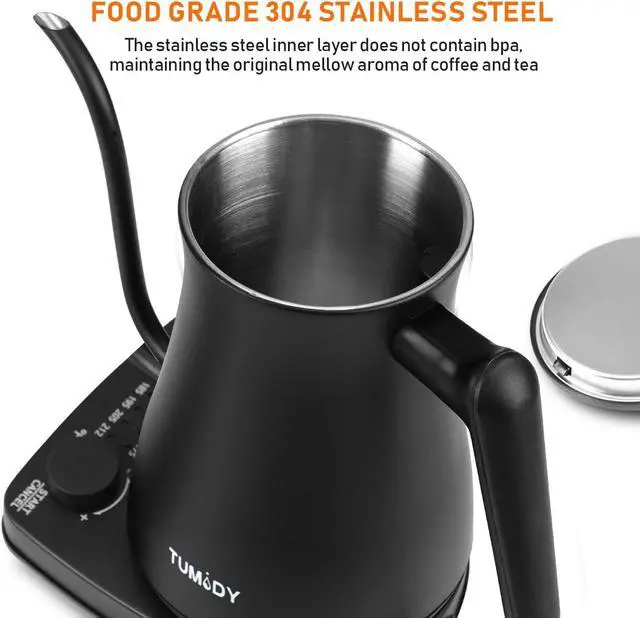 Electric tea kettle gooseneck: The body, lid, and other parts of this electric tea kettle that are in contact with water are made of stainless steel food-grade materials, restore the original and pure taste of tea and coffee; the swan beak and double bottom design have a certain leak-proof effect, which can prevent water from entering the power base. (Note that the top lid is not leak-proof)