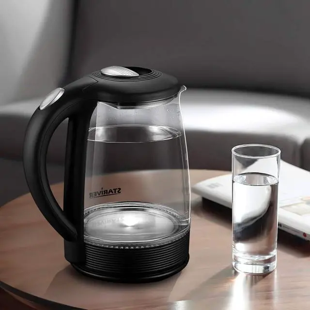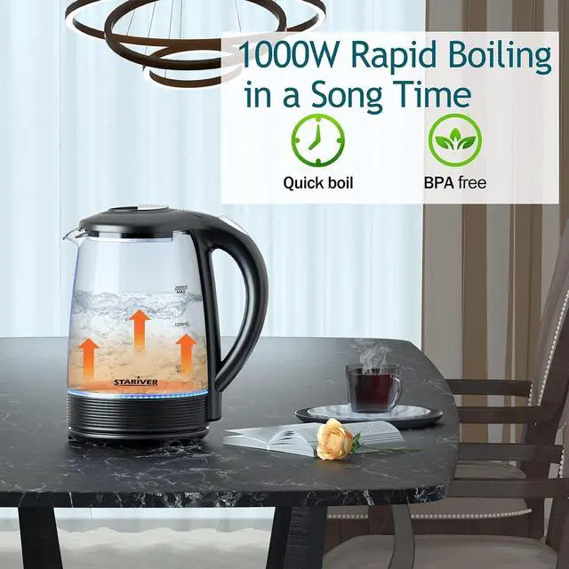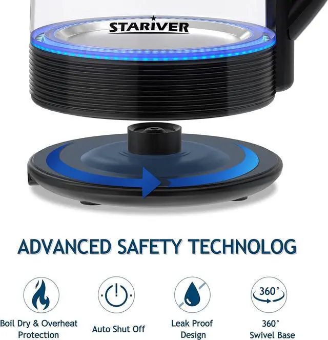 [Gorgeous Design & Portable] - Stariver glass water kettle has a stunning, modern look with streamlined design. The combination of borosilicate glass and blue indicator light technology makes the boiling process fascinating. Indicator lights turn on simultaneously while the electric kettle is heating. Ergonomic design and built with 360° rotational glass body allow you to take the kettle to wherever you want and to pour over easily.