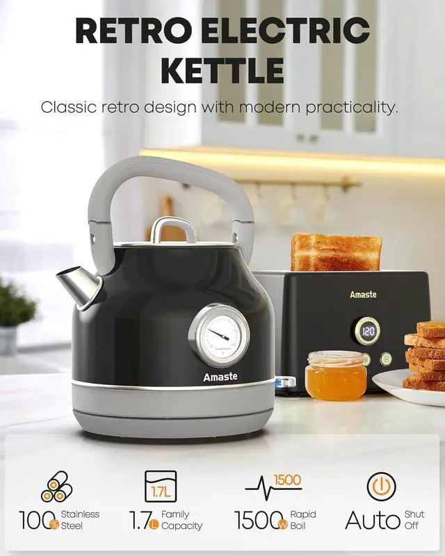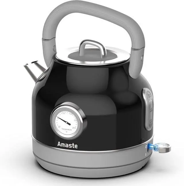 ELEGANT DESIGN FOR EFFORTLESS BREWING. This electric kettle combines vintage aesthetics with modern features, including a retro thermometer to prepare the perfect temperature for various beverages, enhancing the flavor and enjoyment of your drinks. The ergonomic, heat-resistant and foldable handle ensures comfortable, safe pouring and storage.