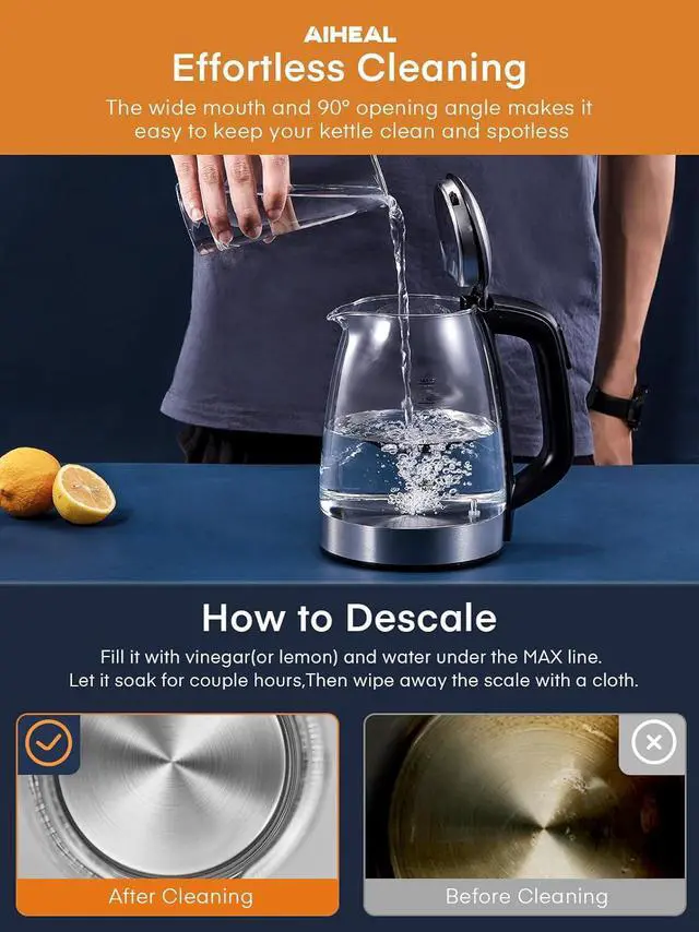 Healthy Materials - The Aiheal Glass tea kettle is made of high-quality borosilicate glass and food-grade 304 stainless steel, which is safe, environmentally friendly, and safe to use. All stainless steel inner covers and all surfaces that come into contact with water are made from food-safe materials.