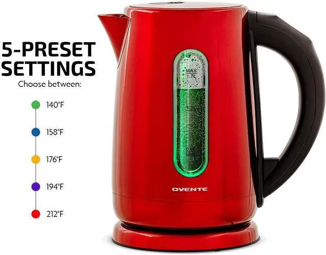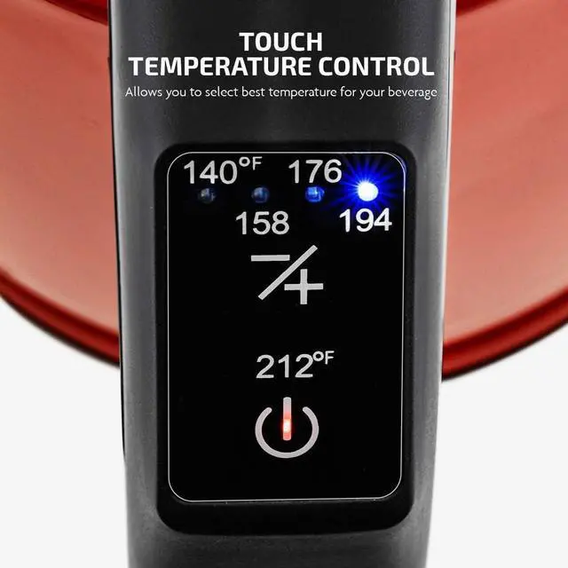5 PRESET SETTINGS Extract the richest taste and fullest flavors from every coffee bean and tea leaf with ease! Simply press the temperature settings button to select the perfect temperature for your beverage, ranging from 140°F, 158°F, 176°F, 194°F up to 212°F. The LED lights at the bottom illuminate in 5 different colors to indicate each preset temperature.