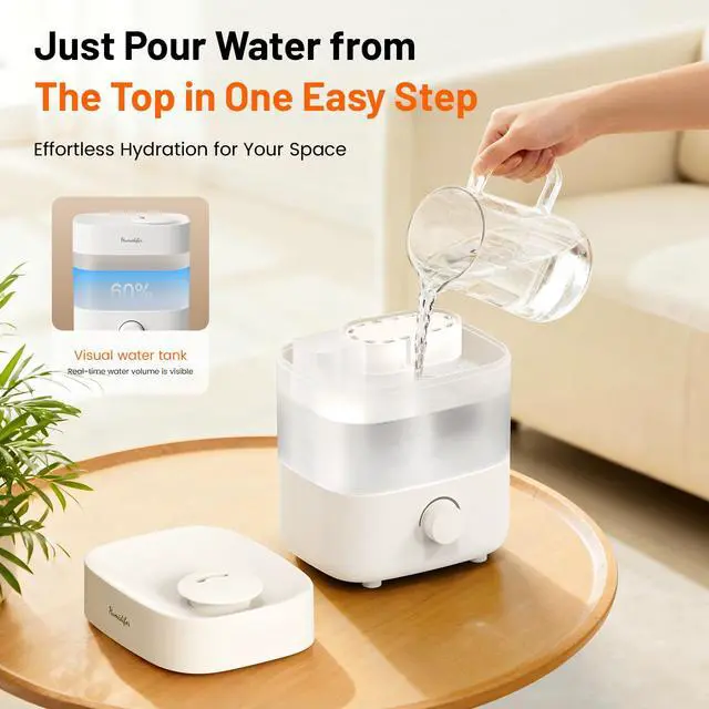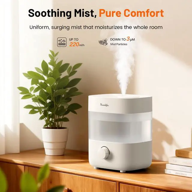 & ° : Enjoy full control with the stepless knob, which lets you adjust the mist volume smoothly to suit your preference. The 360°rotating nozzle allows you to direct the mist precisely where its needed, ensuring even coverage across the entire room.