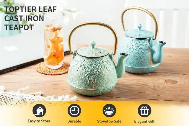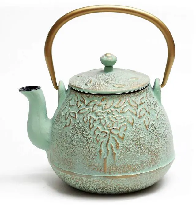The aqua cast iron teapot is crafted with a retro green leaf pattern on its surface, which is a symbol of natural simplicity and purity.
