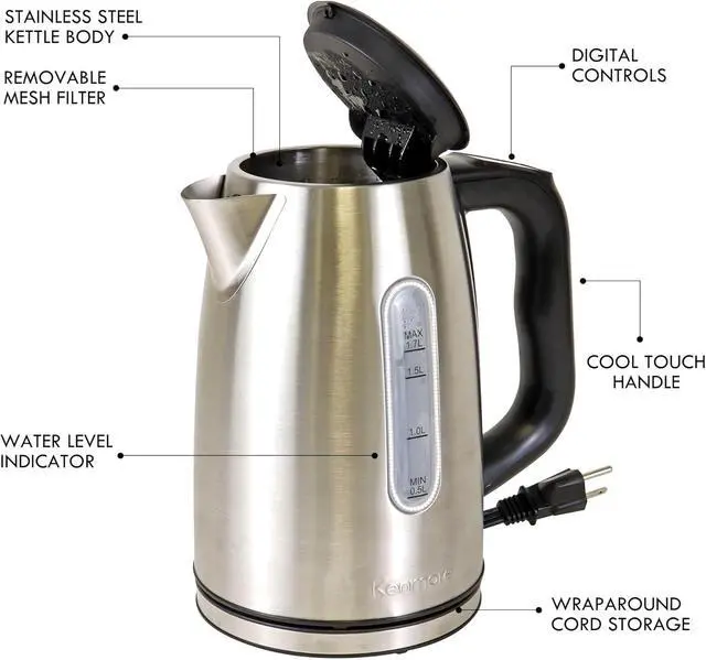 DESIGNED FOR SAFETY - The Kenmore kettle includes several built-in safety features, such as a locking lid, cool-touch anti-slip handle, wraparound cord storage, automatic shut-off when the water reaches the desired temperature, and boil-dry protection. These features ensure safe operation and provide peace of mind, making it a reliable choice for any household.