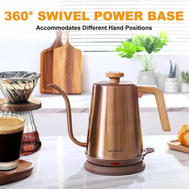 The Gooseneck Electric Kettle with Thermometer is designed for precision and convenience. With a built-in thermometer, you can easily monitor the water temperature as it heats, making it ideal for brewing coffee, tea, or milk at the perfect temperature. The gooseneck design allows for a smooth and controlled pour, perfect for pour-over coffee. This electric kettle features a 1000W power rating for fast heating, boiling 1 liter of water in just 5 minutes. It also includes auto shut-off and boil-dry protection for added safety. Made from stainless steel, this kettle is durable and easy to clean. The copper finish adds a stylish touch to your kitchen.