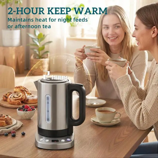 2-hour keep warm function: This electric kettle keeps water warm for up to 2 hours at 60/70/80/90 °C, ideal for night feeds, afternoon tea, or repeated use. Automatic standby after heating saves energy and adds peace of mind
