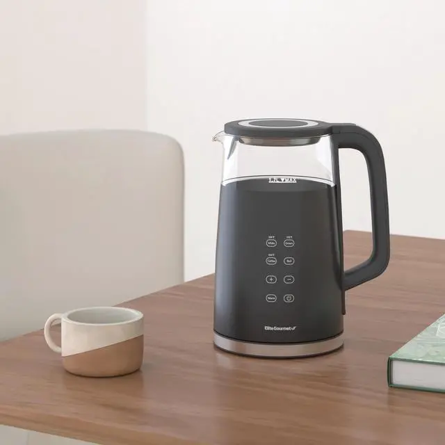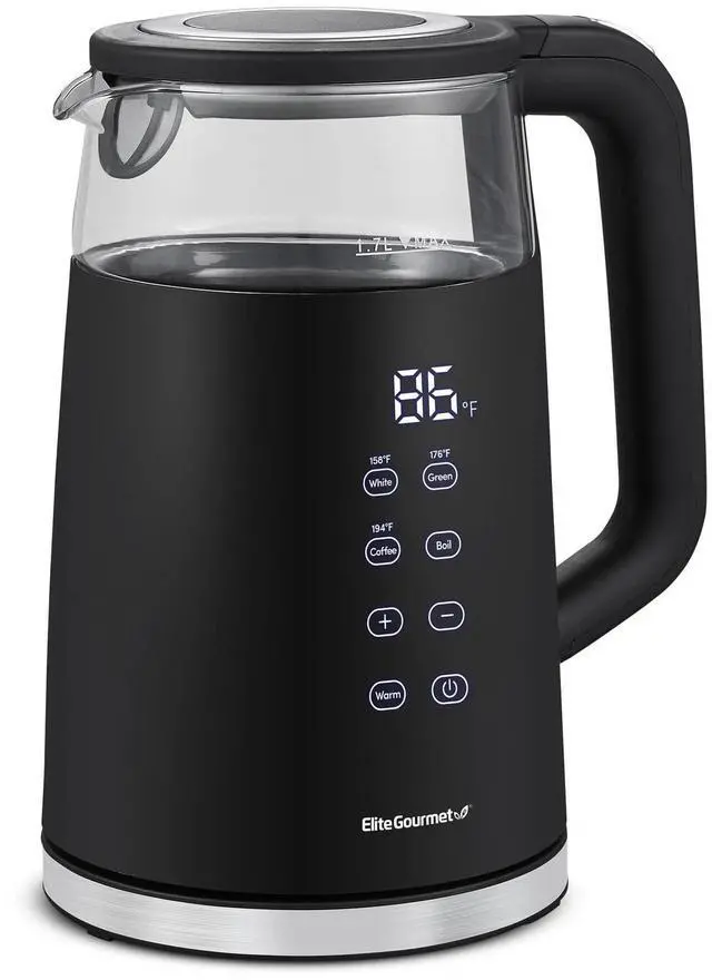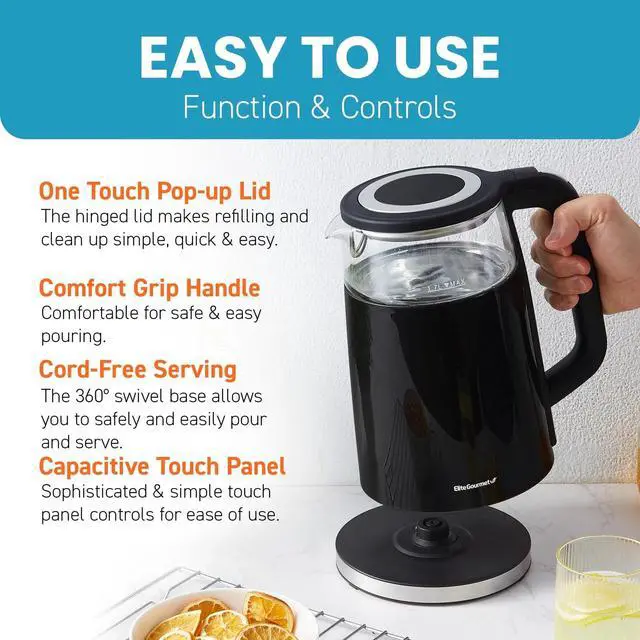 BPA FREE: The Elite Gourmet Touch-Screen Electric 1.7L Water Kettle has a premium #304 food-grade stainless-steel interior, cordless base and BPA-free parts that heat water at the touch of a button.