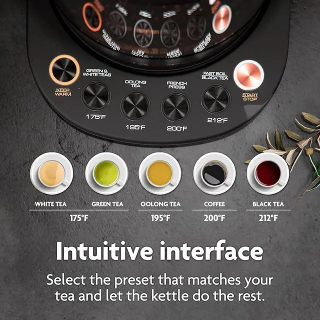 Bespoke Brewing This electric kettle with temperature control settings for white, green, oolong, and black teas. Take your time sipping; your kettle has a 30-minute Keep Warm function.