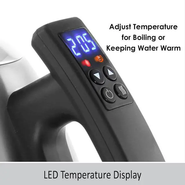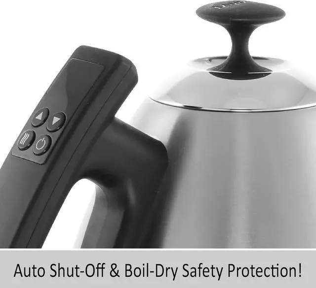 KEEP WARM FEATURE allows you to keep water at your desired temperature for up to an hour before the kettle automatically shuts off (Keep Warm range is 100-195 degrees). Automatic Shut-off and Boil-Dry protection. Limited One Year warranty.