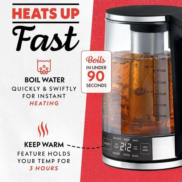 Six one-touch presets for tea, coffee, and boiling water Brew with precision using preset temperatures for delicate tea, green tea, white tea, oolong, coffee, and boil/black