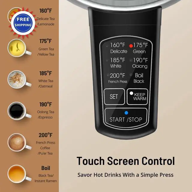 Precise Temperature Control Electric Kettle: Choose from 6 preset temperatures to get the best, most flavorful teas, coffees or simply boil cooking water (160 F for Delicate Tea, 175 F for Green Tea, 185 F for White Tea, 190 F for Oolong Tea, 200 F For French Press Coffee. And "Boil" 212 F for Black Tea, Instant Cocoa, Oatmeal, Noodles, and More)