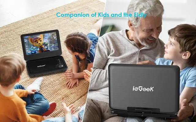Enhanced Brightness Protective Swivel Screen10.5-inch swivel screen supports 270 degrees rotation and 180 degrees folding back. This ieGeek headrest DVD player could be tied to the car seat, the 1024*600 HD screen and double speaker below the screen bring ultimate visual enjoyment to your road trip.