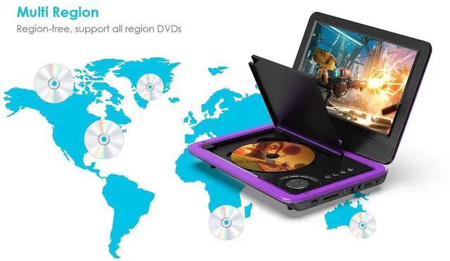 Support Multiple Formats & All RegionsThis portable DVD player for kids support all-region discs of CD, DVD, VCD, DVD±R, DVD±RW, CD-R, CD-RW, CVD, SVCD (not Blu-ray), and also support max 32GB USB and SD card to play AVI, MPG, MPVG4, VOB, FLV, RMVB; MP3, WMA, OGG, AAC (resolution within 720 * 576)