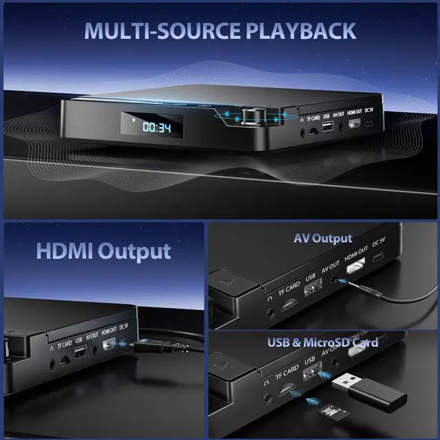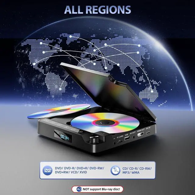 REGION FREE DVD PLAYER: Portable DVD player supports CD/ CD-R/ CD-RW/DVD/ DVD-R/ DVD+R/ DVD-RW/ DVD+RW/ VCD/ XVID and plays media from USB/TF (up to 32GB, FAT32). NOTE: DVD player for smart TV Does not support Blu-ray discs