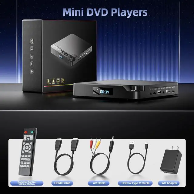 WHAT YOU GET: 1x Mini DVD Players, 1x HDMI Cable, 1x AV Cable, 1x AC Adapter, 1x USB to Type C Cable, 1x Remote Control without battery