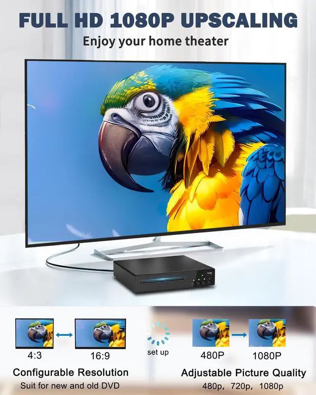 Watch movies in stunning 1080P Full HD with advanced upscaling for sharper details This DVD player enhances standard DVDs to near HD quality for a cinematic experience Perfect for films TV shows and home videos. HDMI DVD player features a dual-system design, supporting both NTSC and PAL format discs