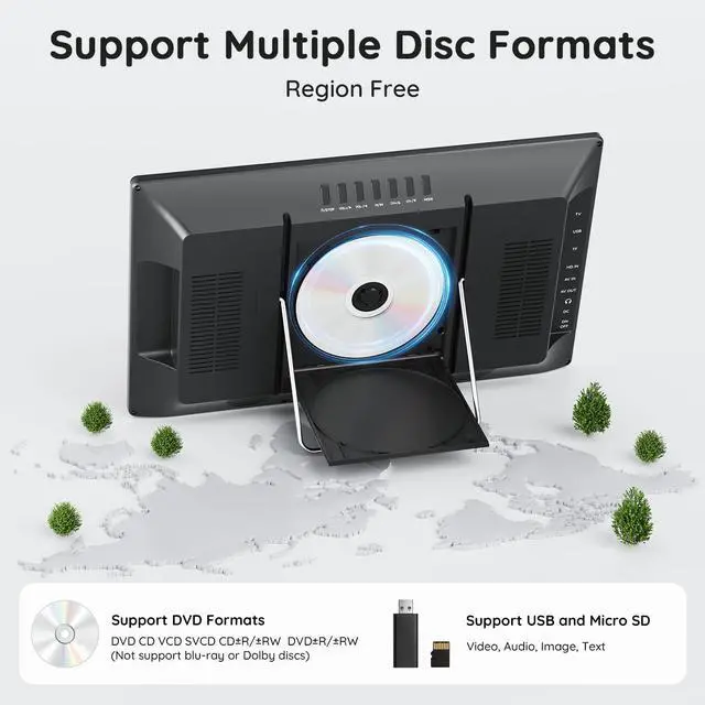 - Built-in DVD Player -Why carry a separate DVD player? Enjoy both your DVD library and over-the-air TV on this portable DVD player -the ultimate space-saver for travel and home. Play DVD, DVD ±R(RW), CD, CD ±R(RW), SVCD ±R(RW), VCD, (Not Blu-ray or Dolby discs).