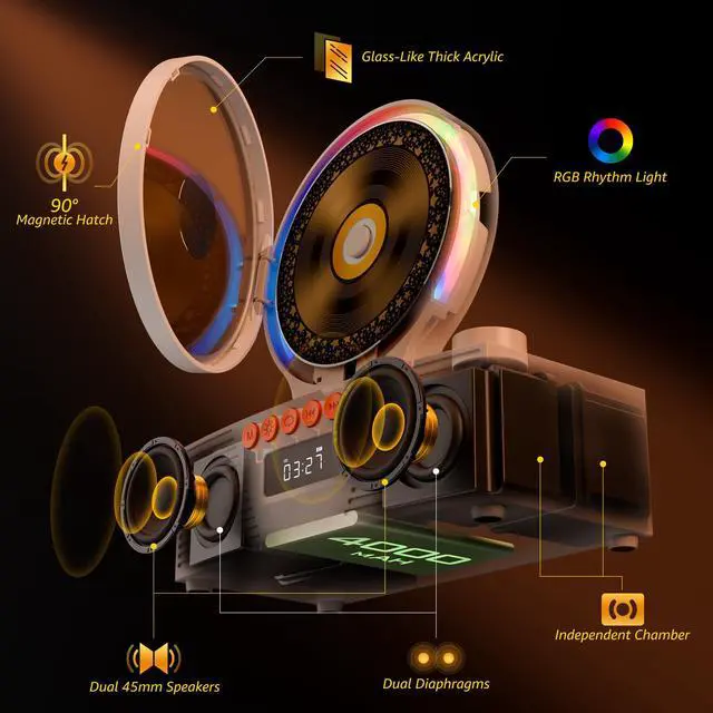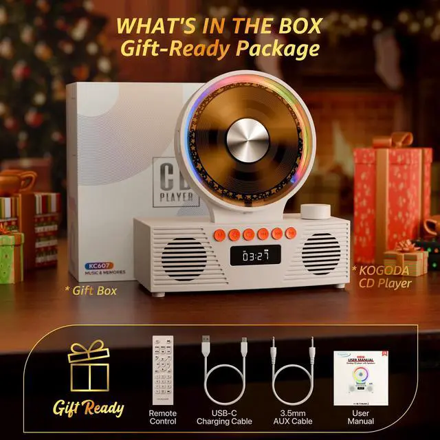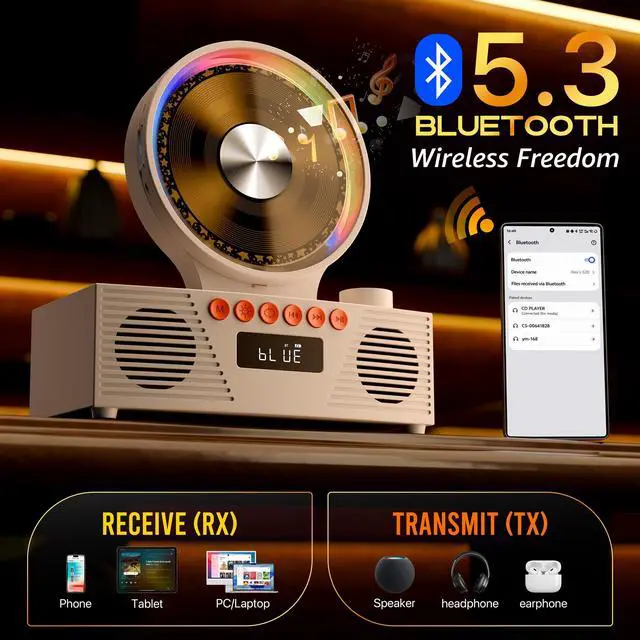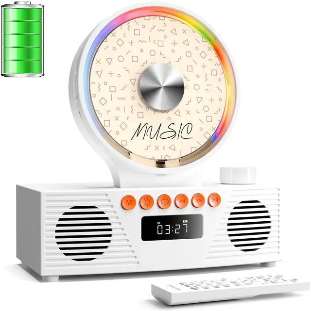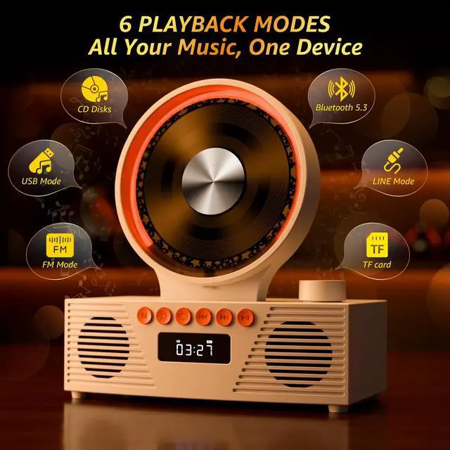 8-in-1 Multifunctional CD Player---CD playback, Bluetooth transmission and reception, FM Radio, U disk support, AUX connectivity, Timer, and Repeat mode. CD mode supports five cd formats including CD, CD-R, CD-RW, MP3, and WMA.