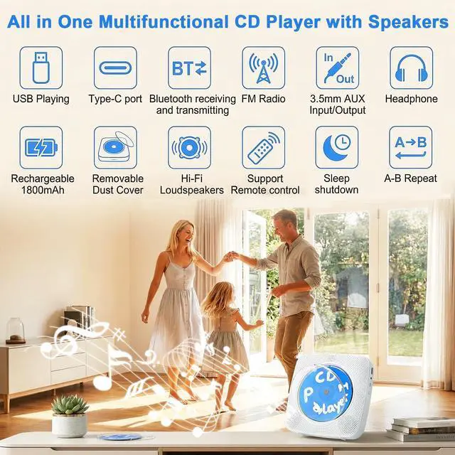 All-in-One CD Player for Home This small CD player replaces five devices: CD Player Plays CD, CD-R/RW, MP3, WMA your complete cd music player. FM Radio Scan 76-108MHz stations with this cd player radio combo. USB Player Plug in MP3 files a compact cd player for data playback. AUX-In Connect phone/MP3 via 3.5mm jack. Bluetooth 5.0 Stream music from phone (receiver) or transmit CD audio to wireless headphones (transmitter).