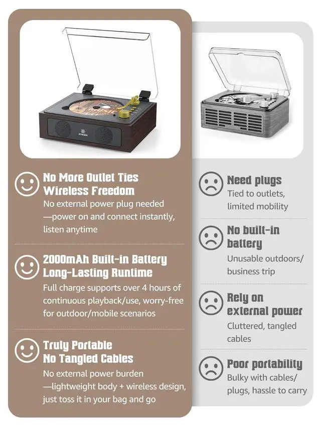 The overall appearance is inspired by the design of a retro record player, and the golden tonearm brings a sense of luxury. Move the tonearm to play music or audio book.