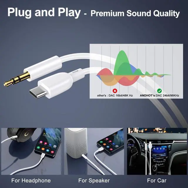 With an advanced DAC chip, this iphone 16 aux cord for car supports up to 24bit/96kHz, providing high fidelity stereo audio output and the cleanest sound experience. Enjoy your fantastic music trip by using this iphone 15 aux cord for car.