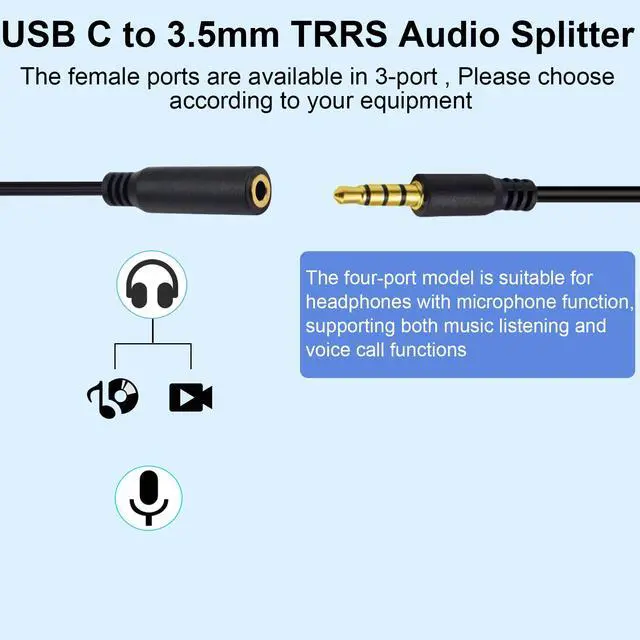USB C to 3.5mm Microphone AdapterConnects a microphone or speaker with a 3.5mm TRRS (4-Port) male output jack directly to a device with a standard USB Type-C device. Note: Audio splitter, NOT for charging.