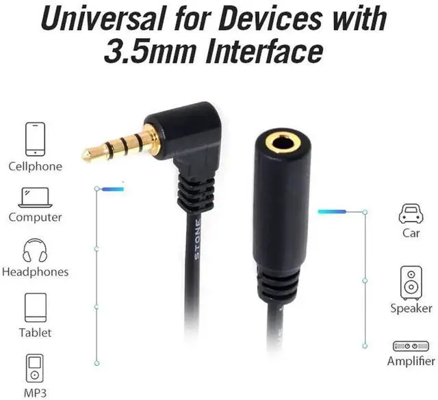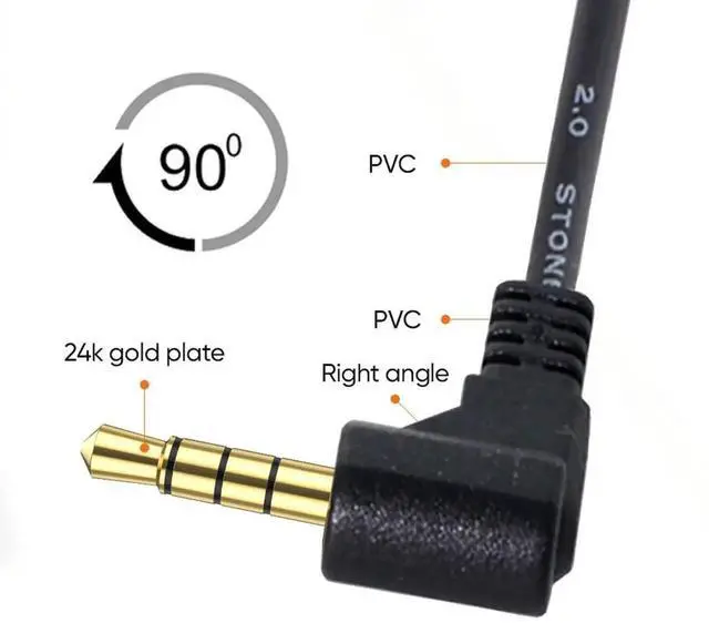 1. Extend the length of your audio cable 90 degree aux cable 2. Perfect sound effect transmission 3. Right angled 90 degree connector for 3.5mm male Connector: One End: 3.5mm Male Plug 3.5mm 3-pole plug The Other End: 3.5mm Female Jack 3-pole