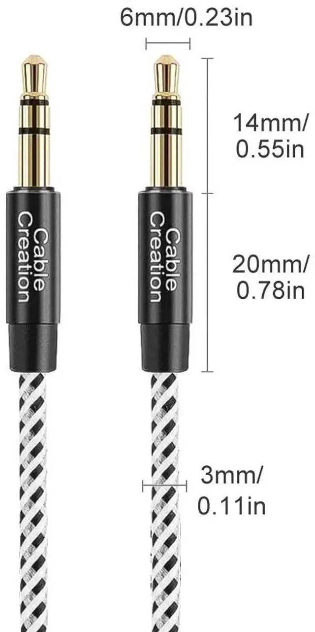 Specifications Side 1: 3.5mm Stereo Male Side 2: 3.5mm Stereo Male Cable: TPE with Black and White braided Cable Length:0.45Meter, Approximately 1.5ft Slim 3.5mm gold-plated connector With special step down design of the 3.5mm gold-plated connector, this audio cable male to male perfect fit with all 3.5mm audio jack devices. Such as iPods, iPhones, media players, and other devices to car stereos, portable speakers, or other compatible 3.5mm audio-output devices. Compatible Devices