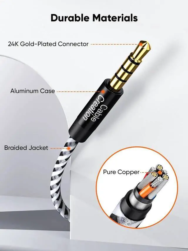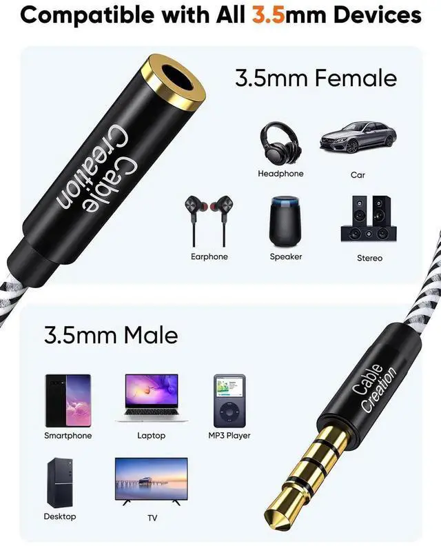 - Universal Compatibility: 4-Conductors auxiliary extension cable fits all devices with standard 3.5mm aux port, compatible with iPhone, iPod, iPad, cellphone, laptop, PC, desktop, tablet, PS4 PS5, Xbox one, TV, MP3 MP4 player, gaming headphone, earphone, speaker, car, amplifier, soundbar and more