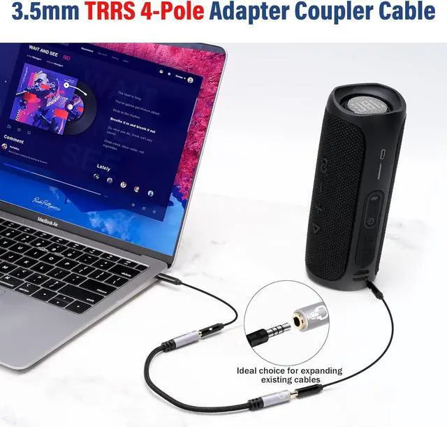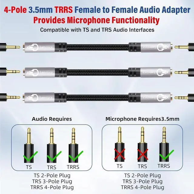 Mic extension cable: Lamroyce 3.5 mm 1/8 Inch 4-Pole TRRS female to female Stereo Headphone Microphone Jack Coupler cable 0.6F eet has two 3.5 mm TRRS audio female port connectors providing a cost-effective way to connect two standard 3.5 mm TRRS stereo headphone cables or extend the length of the extended standard audio cable allowing you to freely listen to music and use the microphone function.