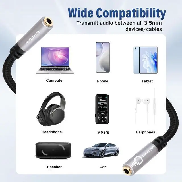 Universal Compatibility: 1/8 Inch 3.5 mm TRRS Auxiliary Mic Audio Stereo female to female Adapter Cable is perfectly compatible with all digital devices with standard 3.5 mm auxiliary jack and Aux input port such as Headphones car stereo or home high-fidelity stereo system.