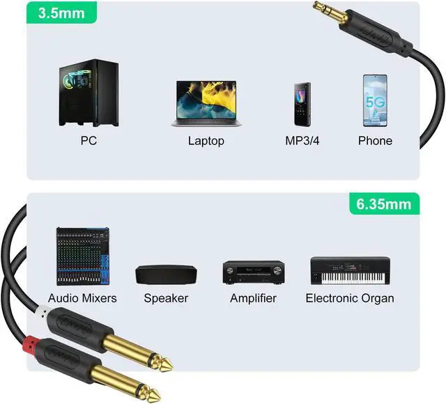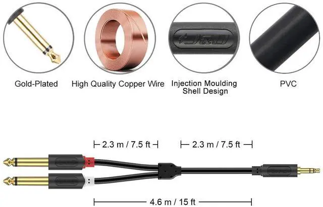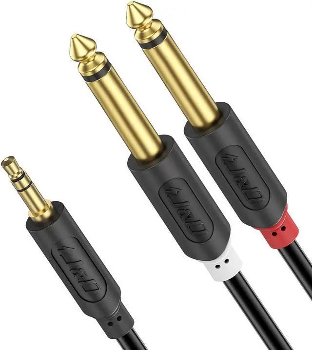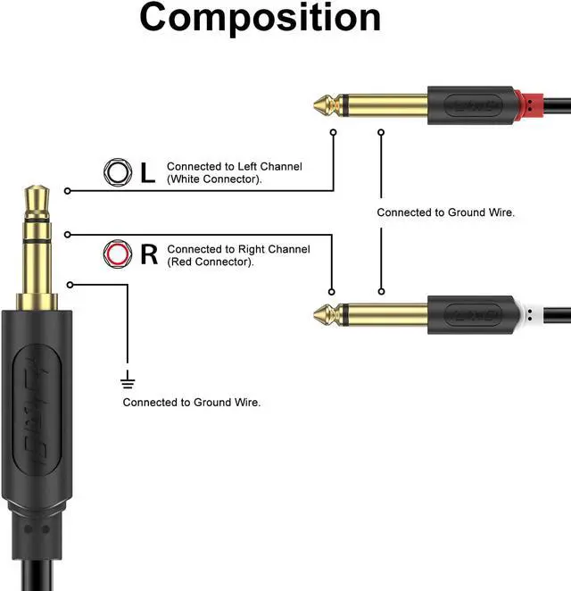 Composition and Excellent Sound: 3.5 mm 1/8 inch Male connector on one end and 2 6.35 mm 1/4 inch Male connectors on the other end (white for left audio and red for right audio); Dual shielding corrosion resistant gold plated connectors making the sound signal transmit with minimal signal loss.