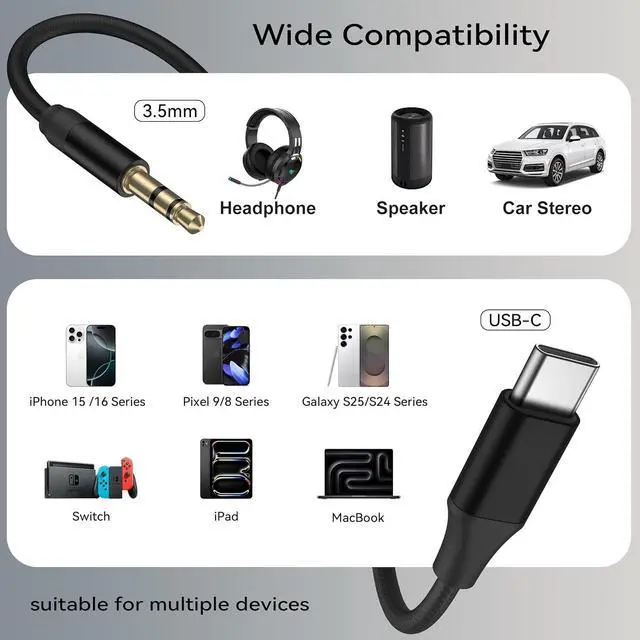 Wide CompatibilityThis USB C to 3.5 mm aux cable cord compatible with iPhone 16 16 Pro 16 Plus 16 Pro Max iPhone 15 15 Pro 15 Plus 15 Pro Max iPad pro iPad Air 4/5 iPad mini 6 Macbook Pro/Air 2023 iMac PS5 Galaxy S25 S25+ S25 Ultra S24 S24+ S24 Ultra S23 S23+ S23 Ultra S22 S22+ S22 Ultra S21 S21+ S21 Ultra S20 Ultra S20 Z Flip S20+ S10 S9 S8 Plus Note 20 10 10+ 9 8 Google pixel 4 3 2 XL One plus 6T 7 7Pro and more. Plug and PlayNo software drivers or complicated connections required.