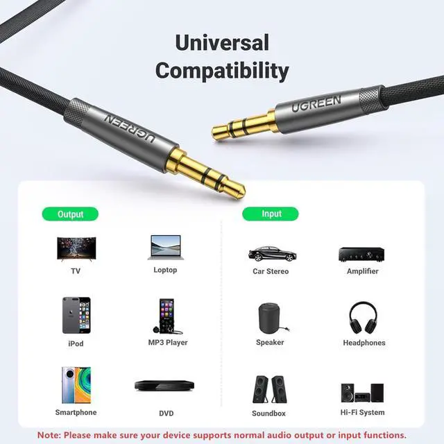 & Portable: Features wear-resistant and tangle-free nylon braid jacket to make it easy to roll up for tidy storage. Reinforced brass shells protect the cord against bending cracking when rolled up. UGREEN 3.5 mm Audio Cable is ready to go and fills you with music wherever you are whenever you likeUniversal