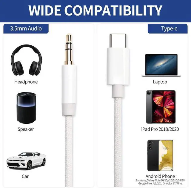 Latest upgrade This usb c aux cord can easily connect your Type C devices to car stereo speakers headphones or any device with 3.5 mm audio jack or Aux-in port. Does not require software drivers and complicated installationensuring the sound of the phone to be perfectly presented in the way you need it. Hi-Fi Sound Quality This usb c to 3.5 mm aux cable cord adopted an advance DAC Smart Chip offer high-definition audio powerful noise reduction you can get higher fidelity sound from it. Enhanced Durability Strong fiber the most flexible strong and durable material increases tensile strength by 200%.